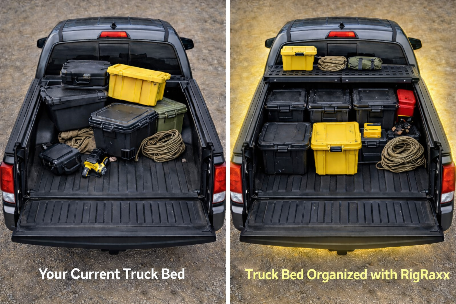 RigRaxx creates usable storage without blocking your bed, your view, or your tailgate. No gimmicks. Just smart organization.